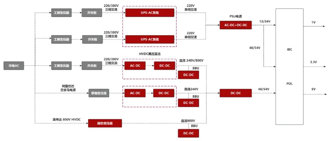 當(dāng)前主流AIDC供電架構(gòu)采用"交流變直流,電壓逐步降"模式:電網(wǎng)10kV-20kV高壓交流電經(jīng)變壓器降至380V三相交流,再通過(guò)不間斷電源(UPS)和服務(wù)器電源(PSU)轉(zhuǎn)換為48V/12V直流。